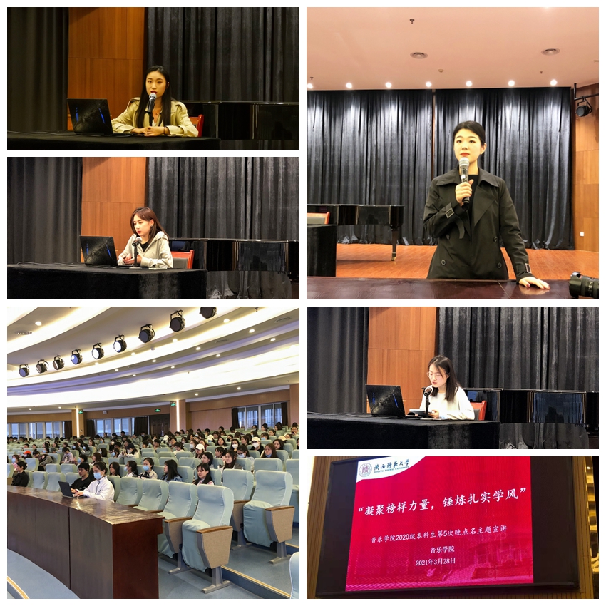 张思凡首先对全年级上学期考试情况进行总结,通报各班学生不及格、学业预警情况。并邀请到三位不同专业的优秀学子分享学习经验。2018级音乐学(公费师范生)韩雨可从公费师范生的角度切入,谈到了通过扎实上好每一堂课,练就过硬本领,学习老师身上的闪光点,从而越发热爱教育事业。2017级音乐表演专业冯欣姝以及2017级舞蹈学(非师范)专业明楚楚从学会预习、整理笔记、高效复习,等角度分享自己的学习经历,同时谈到了许多大学四年的感悟。