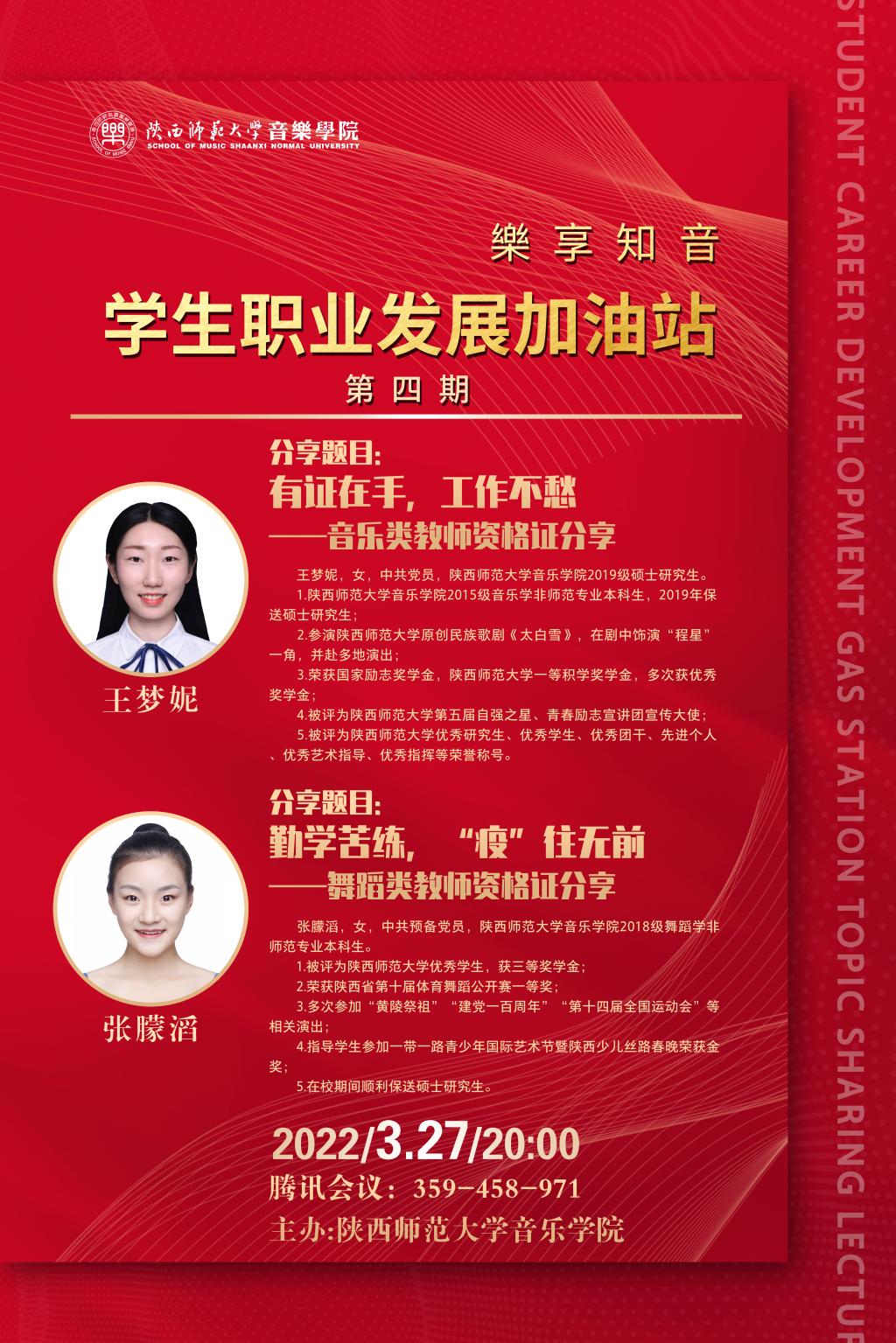 2022年3月27晚,为引导学生合理规划大学生活,开展职业生涯规划,充分了解教师资格证考试相关内容,合理安排学习内容与时间,新葡京在腾讯会议线上举办了“樂享知音•学生职业发展加油站”系列活动第四期。