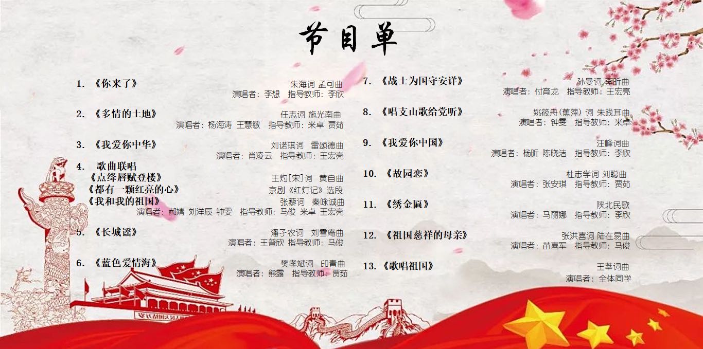 作为陕西师范大学“课程思政”示范课建设项目之一,本次 “云”音乐会的内容涵盖广泛的爱国与历史歌曲,演唱的曲目有传统古诗词歌曲《点绛唇.赋登楼》,传统京剧选段《都有一颗红亮的星》,革命红色歌曲《我和我的祖国》《绣金匾》《唱支山歌给党听》《长城谣》,祖国赞歌《蓝色爱情海》《祖国慈祥的母亲》《我爱你中国》《你来了》等经典曲目,音乐会在全体学生合唱《歌唱祖国》的歌声中圆满结束。