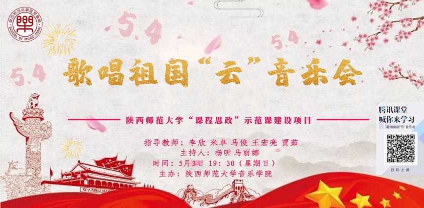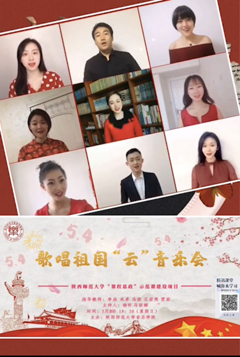 在全国人民齐心协力抗击新冠肺炎疫情高唱凯歌之时,在五四青年节到来之际,为了秉承“热爱祖国,歌颂祖国”的精神,也为了营造积极向上的氛围,使学生“学好歌、唱好歌”,真正实现“音乐为人民服务”的宗旨。5月3日晚,3003新葡官方网站通过“腾讯课堂”网络直播平台成功举办了歌唱祖国“云”音乐会。音乐会由李欣、米卓、马俊、王宏亮、贾茹五位老师指导,杨昕、马丽娜两位同学主持,李想、郝婧、付玉龙等近20名同学共同演出。