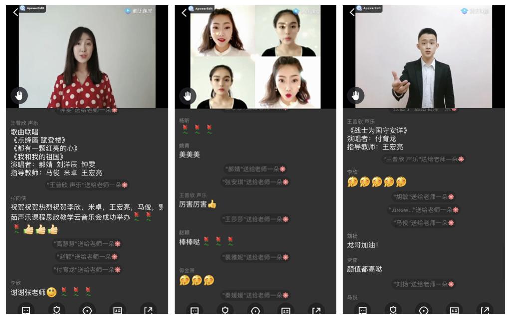 病毒无情,人间有爱。虽然受此次疫情影响同学们不能相聚校园,但是同学们依旧满怀热情,演出成功的背后是同学们坚持不懈的努力和老师们不辞辛苦的指导。在“腾讯课堂”的评论区,同学纷纷表示:作为新时代的青年,一定要不忘初心、牢记使命、砥砺前行,与祖国共奋进,在中华民族伟大复兴的道路上贡献自己的力量!