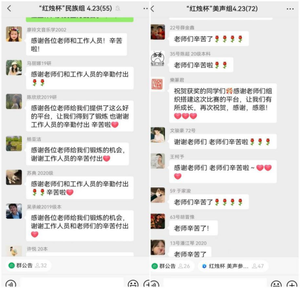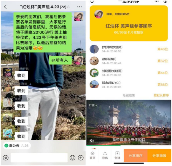 在面对疫情、网课、期末考试等复杂事务下,同学们依然认真准备、积极参与其中,对首届“红烛杯”声乐比赛十分珍视。在4月14日,筹备工作过半,民族组与美声组分别进行了线下与线上参赛抽签仪式。